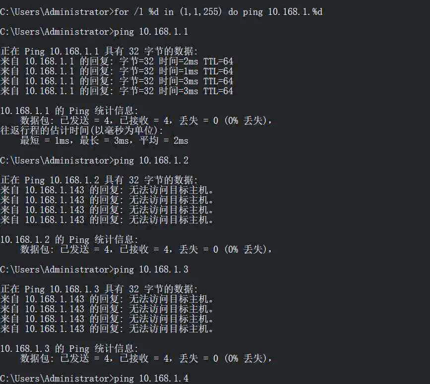 当输入批量ping命令后,该命令会自动对网段内的所有IP地址进行逐一测试,直至检测完毕。在代码中,(1,1,255)指定了网段的起始和结束范围,即从192.168.1.1到192.168.1.255,每次递增1个IP地址,共计检测255个IP。若发现某些IP地址无法ping通,则可能是网络设备存在问题,需要进一步检查。